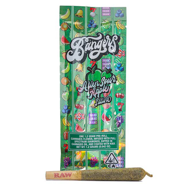 Experience an electrifying jolt with our Sour Apple Diamond and Kief Infused Pre Roll. This Sativa-dominant blend packs a punch with its tart apple essence and powerfully invigorating effects.