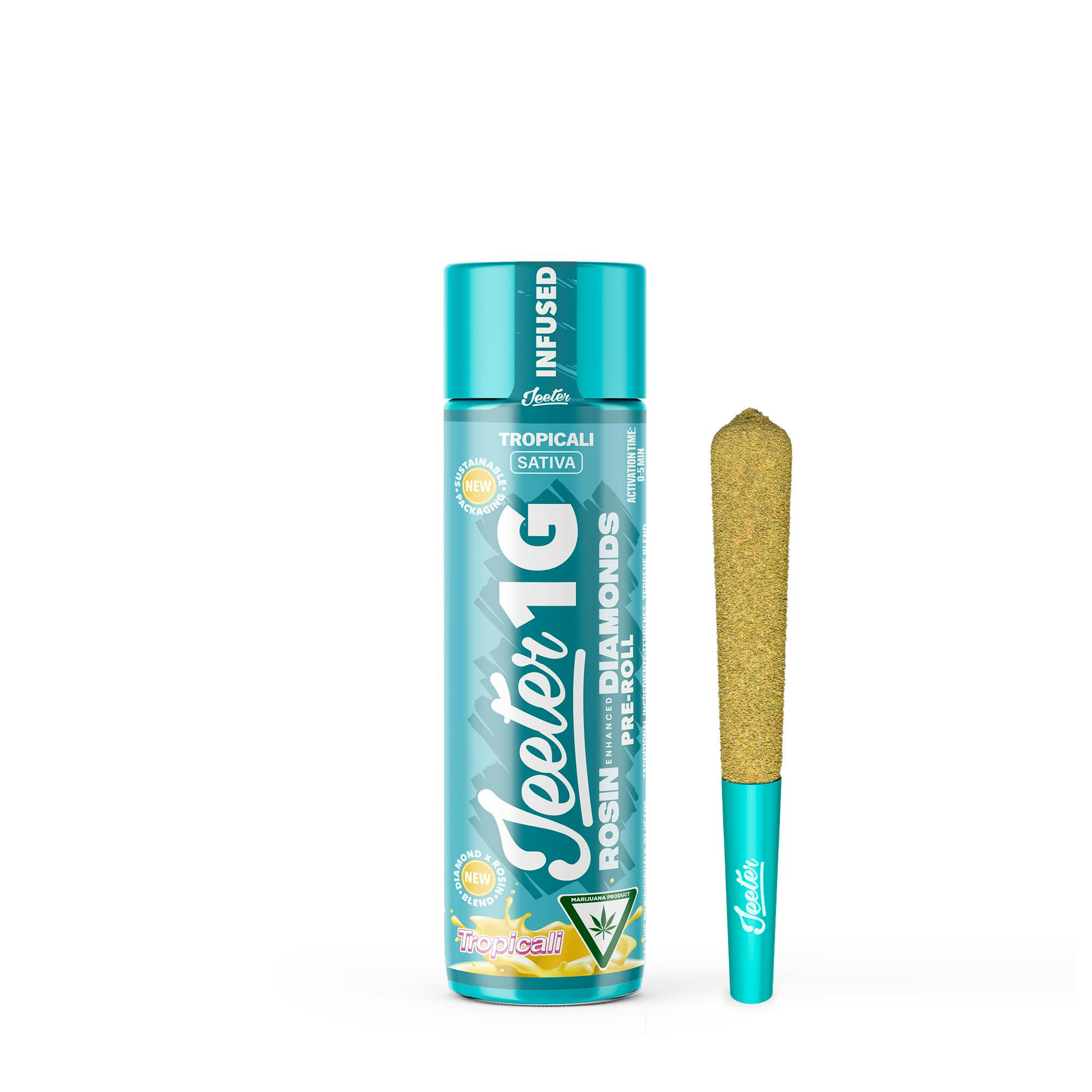 In each jar, you'll find a hand crafted, hand rolled 5 0.5-gram Jeeter joints. They're made with premium indoor grown flower, infused with Liquid Diamonds, and dusted in kief. 5-minute burn time each.