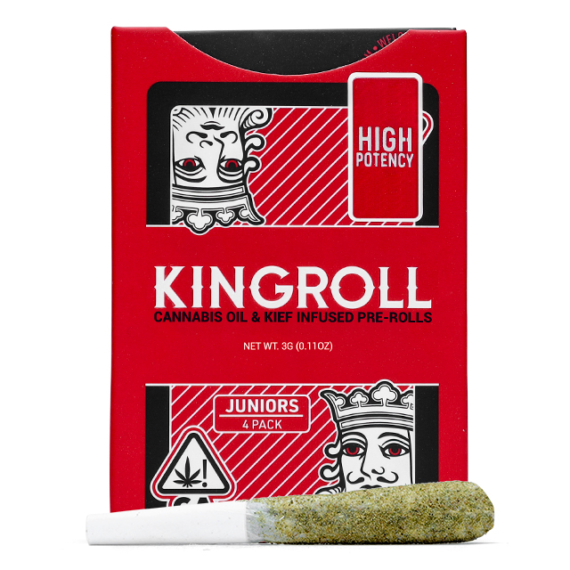 Each Kingroll is handcrafted blending two unique and complementary flavors to taste: our award-winning Loudpack flower and Kingpen’s award-winning oil. Our cultivation and distillation teams work together to pair each unique flavor. Kingroll strains are small batch and will rotate with harvest. Kingroll Juniors, your new favorite multipack. Every box of Juniors contains 4 individual .75 gram kief coated pre-rolls, infused with Kingpen's award-winning cannabis oil and combined with high-quality flower. Great for multiple clean, slow-burning seshes. WHY IT HITS DIFFERENT. Kingpen Oil - Kingrolls are infused with Kingpen's award-winning oil in strains you know and love. Kief-Coated - Golden kief, sourced from premium flower, for an added punch of cannabinoids and natural terpenes Natural Rolling Paper - Super thin, unbleached paper with the highest quality-control standards, so you only taste the terps, not the paper. Premium Flower - High quality, single strain, never shake. LEARN MORE HERE