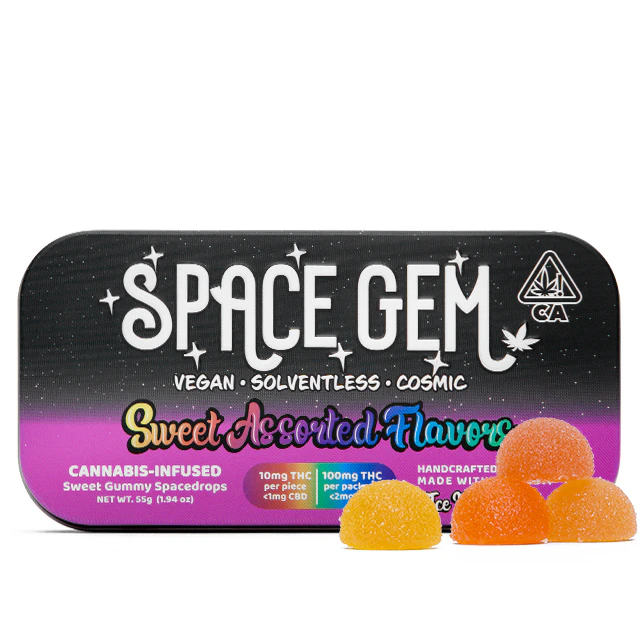 Sweet SpaceDrops contain ten individual gummies in a rainbow of flavors. Each gummy provides 10mg of THC from single source ice water hash to elevate your being. All Space Gem products are handmade in Humboldt County with organic and vegan ingredients, natural flavors and colors, and love.
