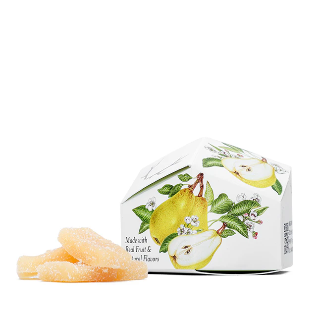 Ingredients: Sugar, Tapioca Syrup, Water, Pear Juice Concentrate, Gelatin, Coconut Oil, Natural Flavoring, Citric Acid, Malic Acid, Pectin (Pectin, Sodium Citrate), Cannabis Extract, Hemp Extract, Sunflower Lecithin. Contains: Coconut