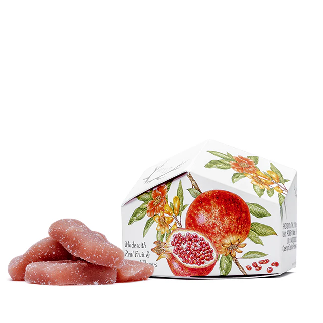 Ingredients: Sugar, Tapioca Syrup, Water, Pomegranate Juice Concentrate, Gelatin, Natural Flavoring, Coconut Oil, Citric Acid, Malic Acid, Pectin (Pectin, Sodium Citrate), Cannabis Extract, Hemp Extract, Sunflower Lecithin. Contains: Coconut