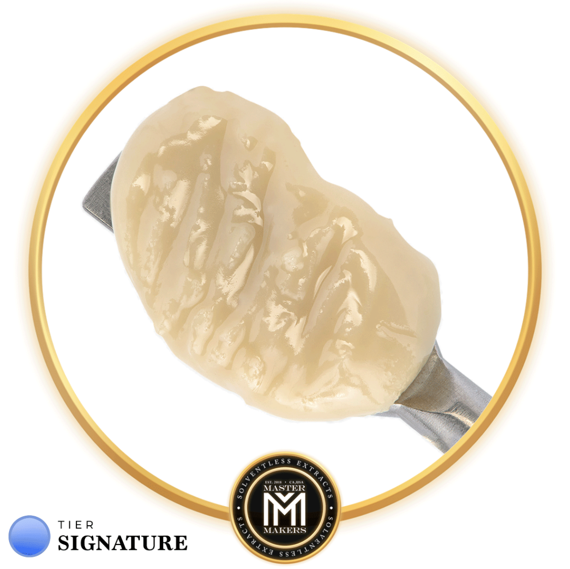 Perfectly cold cured rosin is an art. First our QC team carefully selects the perfect ratio of ice water hash microns unique to each genetic, then the rosin is pressed and cured for several weeks. Once it has reached its peak maturity, we hand whip into a velvety texture with great color and exceptional flavor profile.