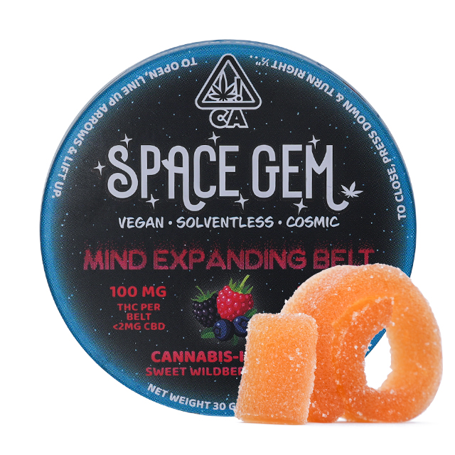 The Mind Expanding Belt is the first ever single flavor Space Gem gummy. This Full Spectrum, Gluten Free, Vegan edible is sure to expand your mind and elevate your being. Infused with premium solventless hash and made using all organic ingredients including real fruit for the flavoring and containing 50% less sugar than the SpaceDrops. Each 100mg belt has ten 10mg scored pieces for easy dosing. Convenient for high dose users, one whole belt is 100mg