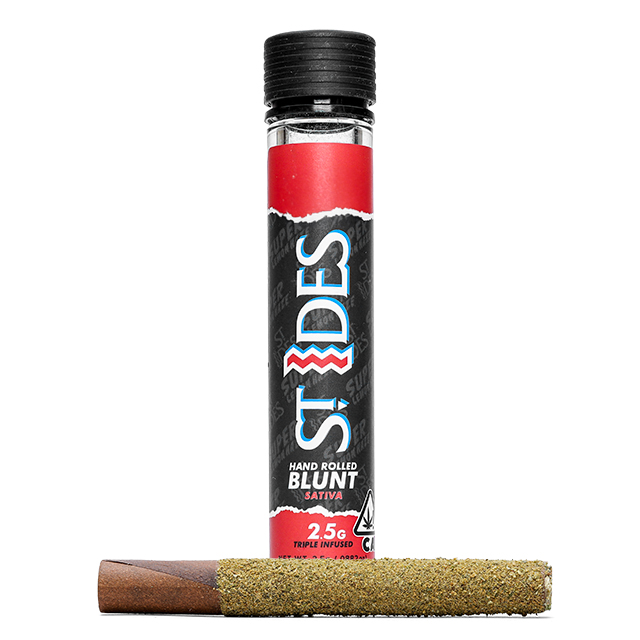 Meet the power punching St. Ides 2.5 gram blunt. This blunt features whole nugs of premium indoor, hand broken flower. Consistently tests over 40% THC. It's triple infused with diamonds, hash, and then generously coated in kief. Each blunt has a glass tip and is hand rolled for that personal touch guaranteed to hit! Perfect for the celebratory moment, or just for the casual sesh with your homies, this blunt is sure to get you where you want to go.
